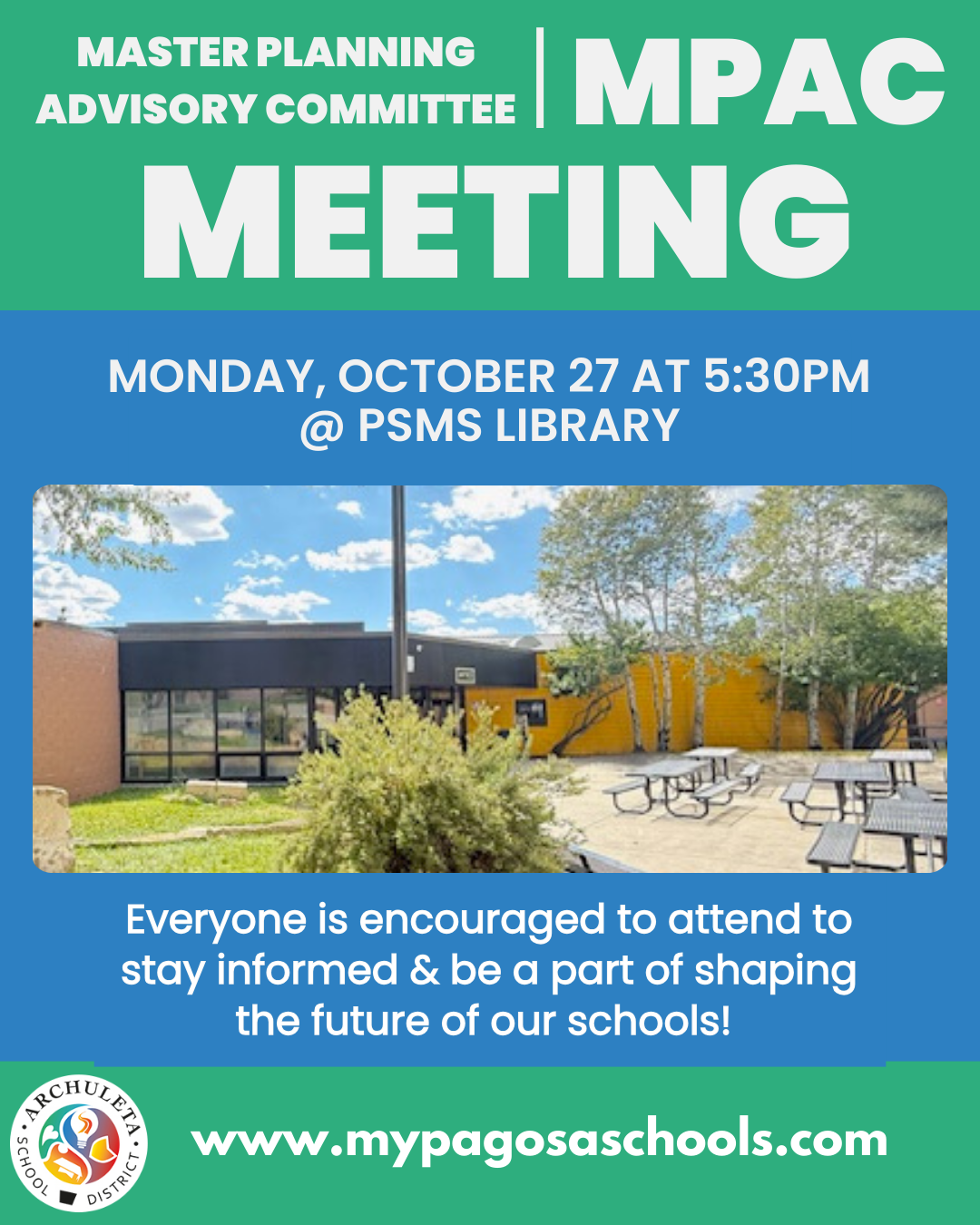Archuleta School District is planning for the future of education in our community. Last spring, the Master Planning Advisory Committee (MPAC)—a group of parents, staff, and community members—recommended building a new PreK–8 school on the district’s top priority. Learn more